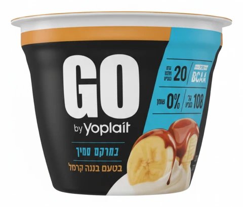 Йогурт GO густой и кремовый со вкусом банана и карамели, с добавлением белка. 0% жирности. Каждая единица весит 200 г. Упаковано в комплект из 2 штук.