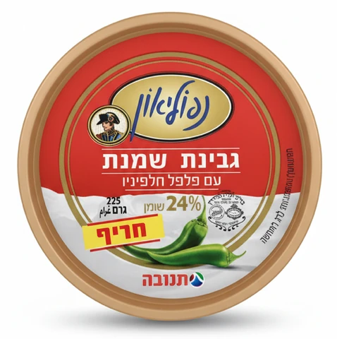 גבינת שמנת נפוליאון בטעם פלפל חלפיניו, 24% שומן, 225 גרם. מיוצר על ידי תנובה, ישראל.