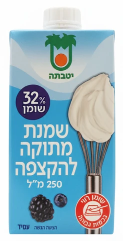 שמנת מתוקה להקצפה 32% שומן, מבית יטבתה. בעלת השגחת מהדרין. מכיל 250 מ"ל. שמנת עמידה לקצפת.