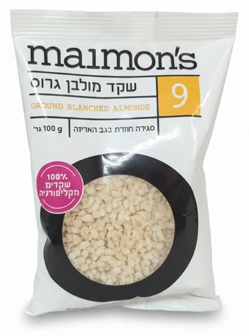 Бланшированный дробленый миндаль весом 100 грамм. Бренд Миמוнс. Произведено А.Л. Производство и Маркетинг Специй.